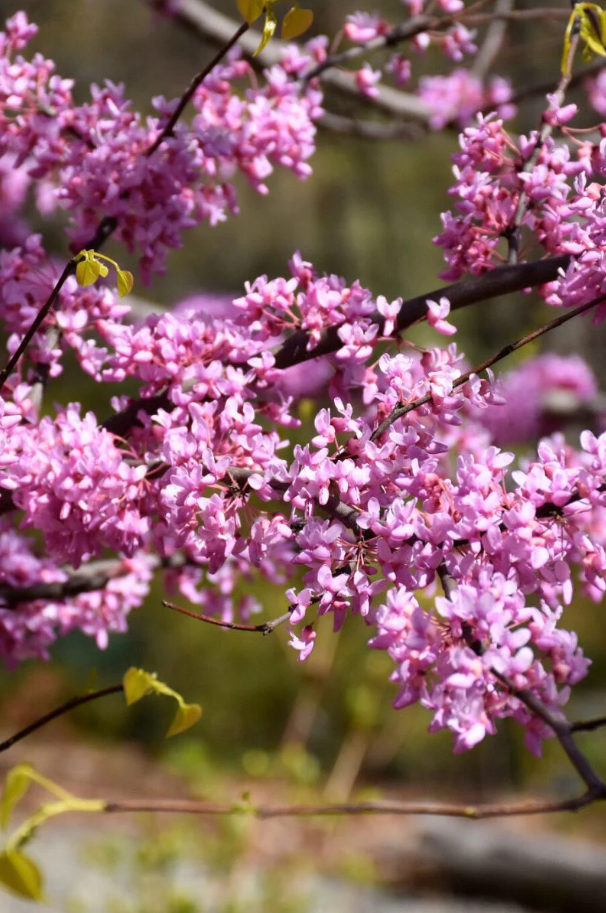 In March to April, Hearts of Gold Redbud produces clusters of small, rosy-pink flowers that bloom directly on the branches. These early blooms attract bees and other pollinators, providing a vital nectar source when few other plants are flowering, supporting early-season biodiversity in the garden. -