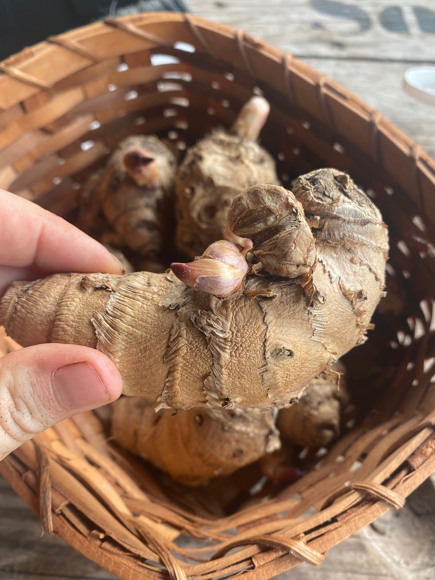 Its large, banana-like leaves add bold texture to the garden, and the plant produces delicate, cone-like blooms that are pale pink to white in summer. Even without harvesting the root, this plant adds aesthetic value to tropical-themed beds. -